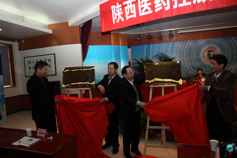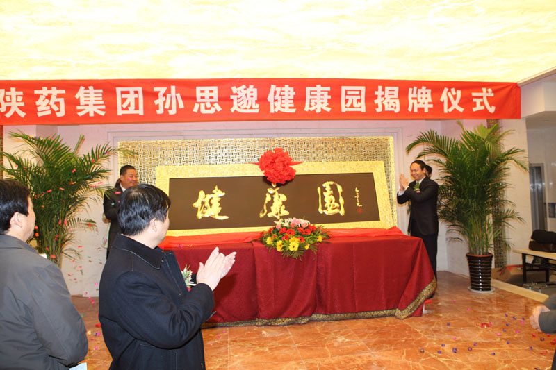 陕药集团总药剂师张剑致辞,总经理翟日强(右)、西夏房地产公司董事长姚建东(左)为陕西孙思邈健康有限责任公司揭牌