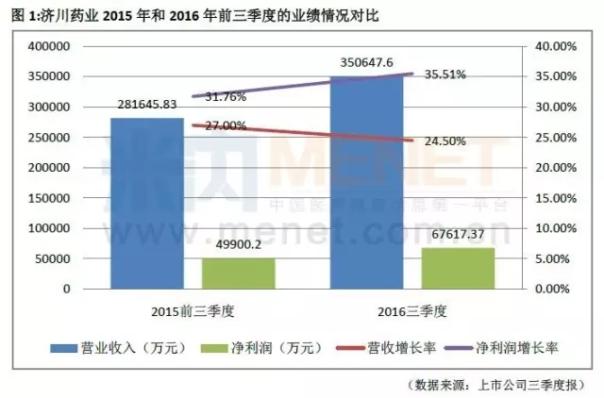数据显示,济川药业今年前三季度的营业收入保持在30%以上的增长,而净利润保持在20%以上的增长,整体的发展势头是稳中有升。该企业2016年前三季度营业收入35.06亿元,增长率轻微下降至24.5%,而净利润为6.76亿元,增长率上升至35.51%。