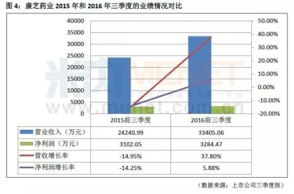 康芝药业2016年紧密围绕着年初制定的坚持“儿童大健康战略”和“精品战略”,提升康芝儿童药品牌;加强产品市场准入工作,实现营销突破;优化供应链体系,降低运营成本,以提升公司竞争力,这一战略部署一直得到了较好的开展及取得了不俗的成绩,前三季度的营业收入与净利润都与去年同期相比有了很大的提高,营业收入突破了3亿元关口,增长率超过了37%。