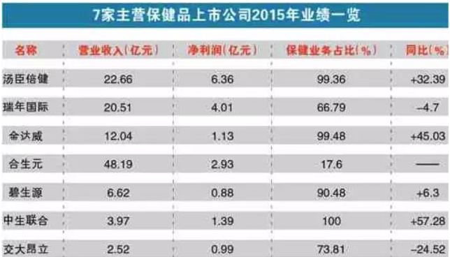 主营保健品上市公司是指其所拥有的保健食品与进口膳食营养补充剂的营业收入占公司整体营业收入在50%以上的上市公司。据2015年年报显示,7家排名靠前企业依次为:汤臣倍健、瑞年国际、金达威、合生元、碧生源、中生联合和交大昂立。